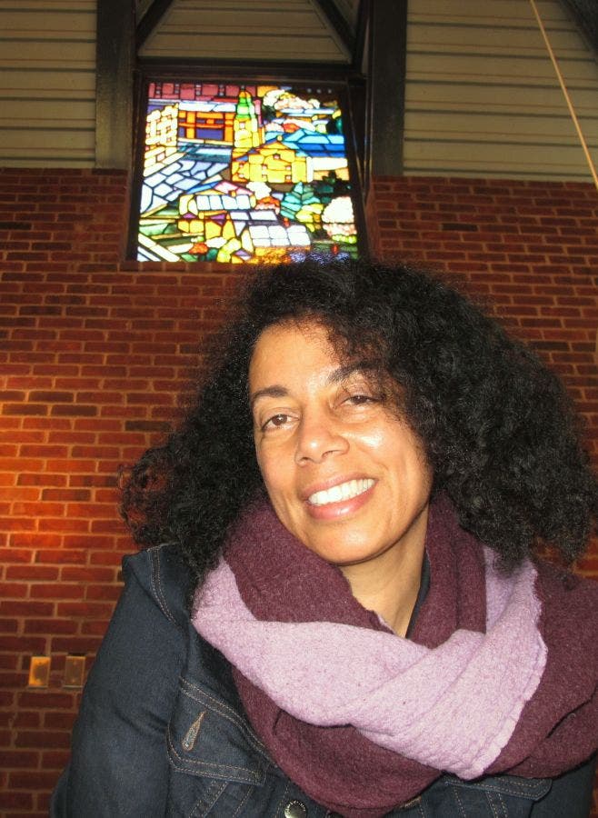 Photo caption: Artist Tova Snyder with one of the 12 glass panels she created for the Harrison train station. Photo credit: Submitted.