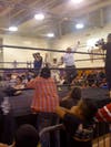 At a New Rochelle High School fundraiser for the girls basketball team, a line-up of pro wrestlers entertain the crowd.