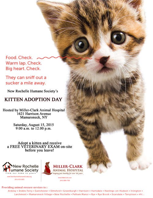 Miller-Clark Animal Hospital is partnering with New Rochelle Humane Society to host a Kitten Adoption Day on Saturday, August 15 from 9:00 a.m. to 12:00 p.m. at their Veterinary Offices at 1621 Harrison Avenue in Mamaroneck.