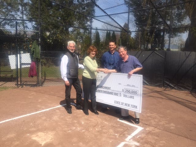 Photo: Assemblyman Steve Otis presents a check for $250,000 to the Village of Larchmont Mayor Anne McAndrews, Larchmont-Mamaroneck Little League president, Bill Nachtigal, and Fields for Kids president, Jim Hanley. The monies will be used to help construct a home for the local Little League with two additional natural-grass baseball fields, renovation of the existing field, new team benches, fences, scoreboards and spectator seating. Photo credit: Suzanne Despins