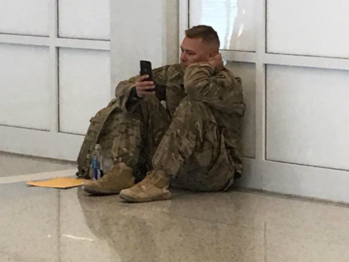 By the time the story of Millie's birth came out, a photo of the camouflage-wearing Brooks Lindsey glued to his cellphone as he sat alone on the airport floor had already captured the world’s heart. Tracy Dover snapped the photo, then posted it on Facebook with the message: