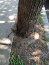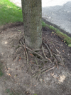 The second picture is an example of blatantly bad planting: the burlap and the strapping are still in place! The soil eroded around the top of the root ball, exposing the original roots that were in the root ball when the tree was planted. The size of these roots show, by the way, that the tree in question has been quite some time in a field and the mature roots were cut relatively close to the stem, with as result that the original root ball lacked and most likely still lacks many of the fibrous roots that are essential for the water intake. The future of this tree does not look bright.