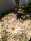 And then the third picture shows a tree that did its utmost best to grow, but the burlap was not removed neither the nylon wrapping string. The tree base is all deformed: twisted and constricted.