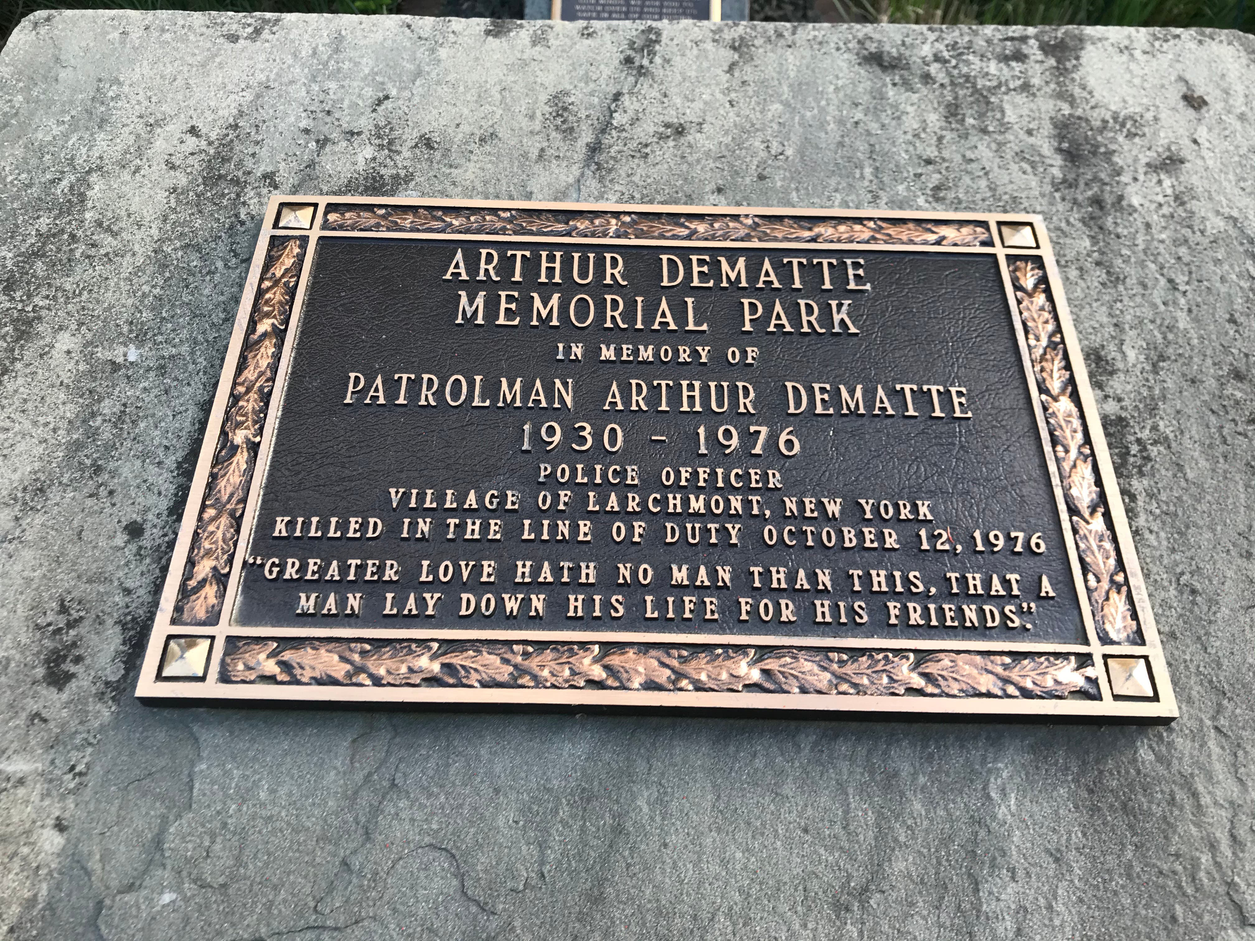 The words on the plaque honoring Patrolman Arthur DeMatte read, "Greater love hath no man than this, that a man lay down his life for his friends." The marker pays tribute to the Larchmont police officer who was killed in the line of duty on October 12, 1976.