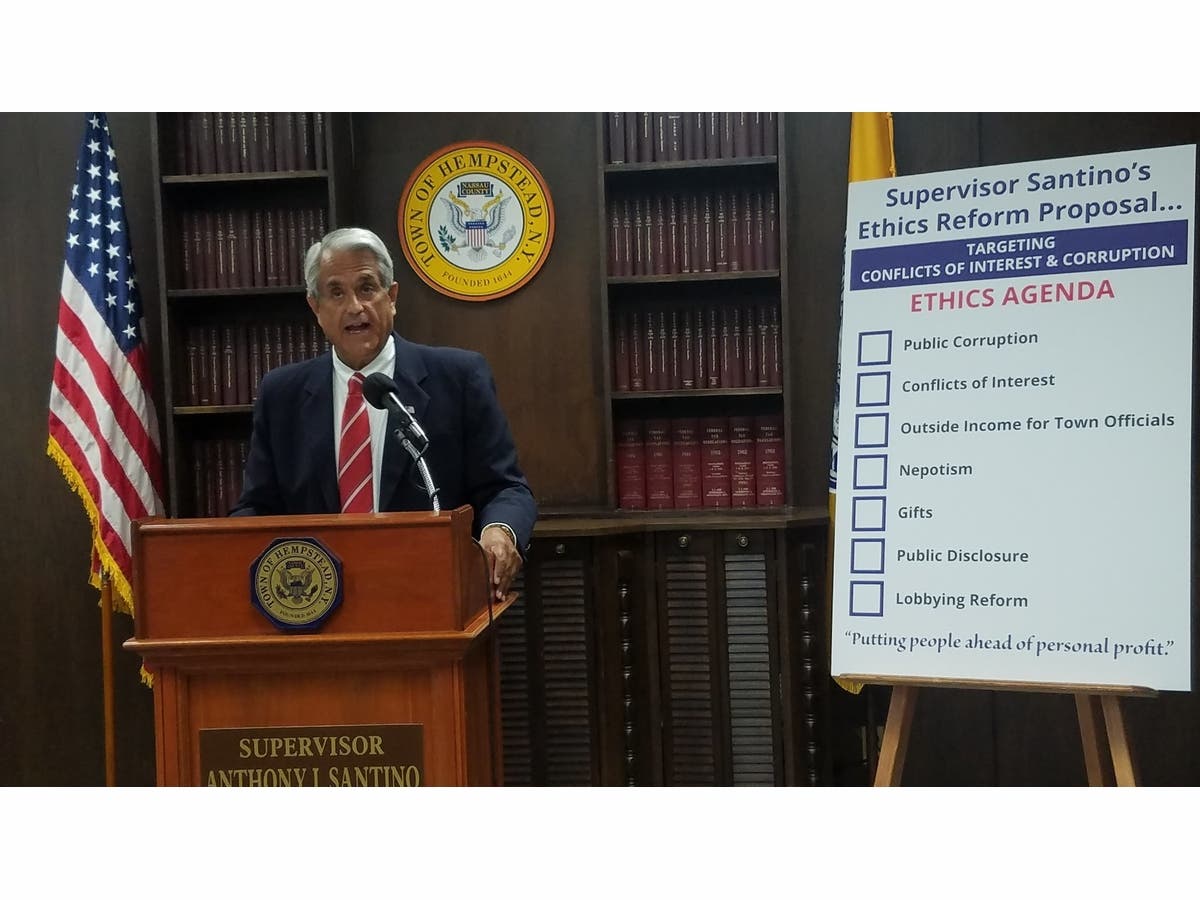 Hempstead Town Supervisor Anthony J. Santino has announced that he will be proposing comprehensive ethics reform legislation, and calling a hearing on it at the Sept. 5 Town Board meeting. The reform package would place strict limits on outside income for elected officials, enhance public disclosure requirements and aggressively target conflicts of interest.