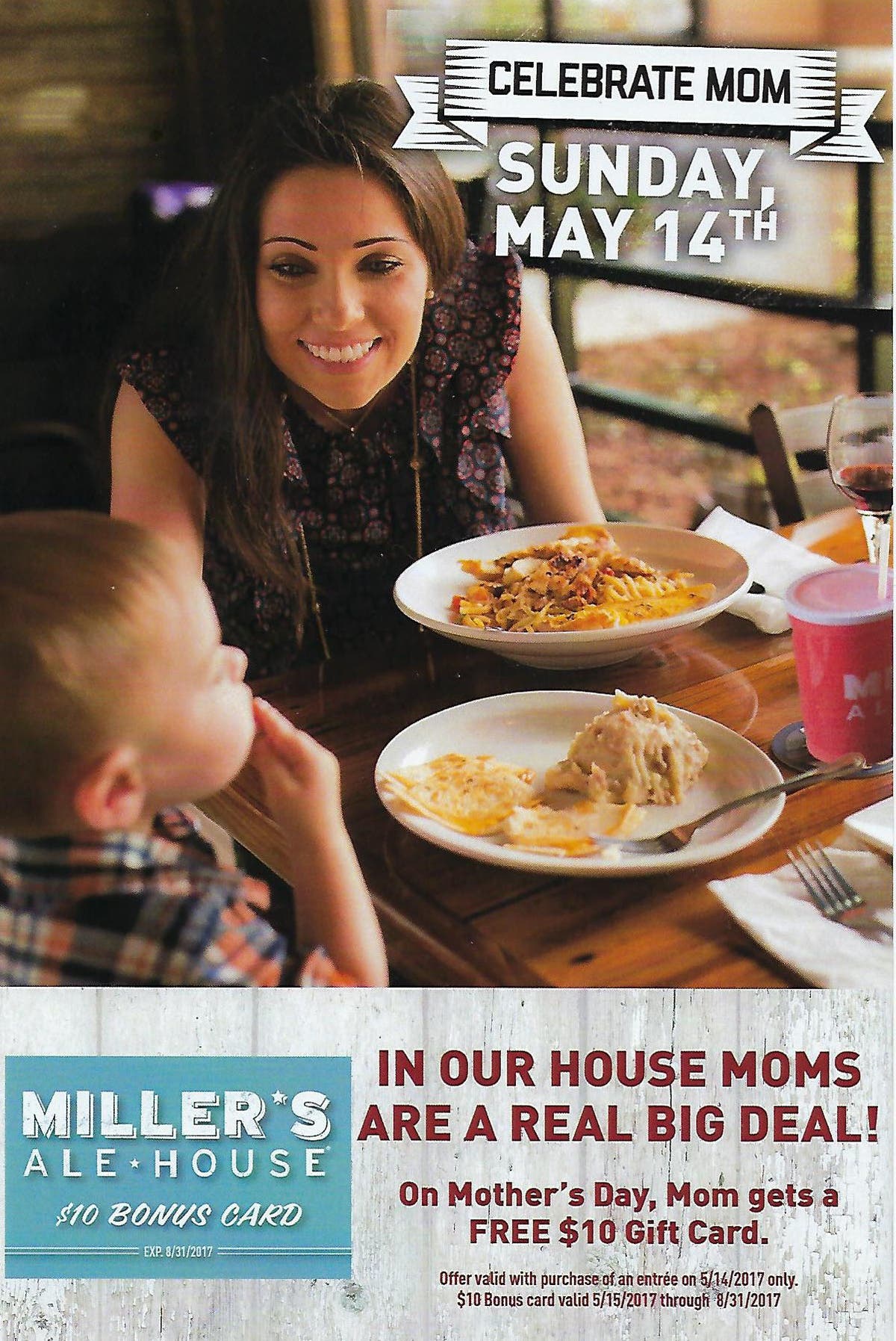 The managers at Miller's Ale House want moms to come celebrate their special day with us. A $10 gift card will be given to all moms ordering an entree.