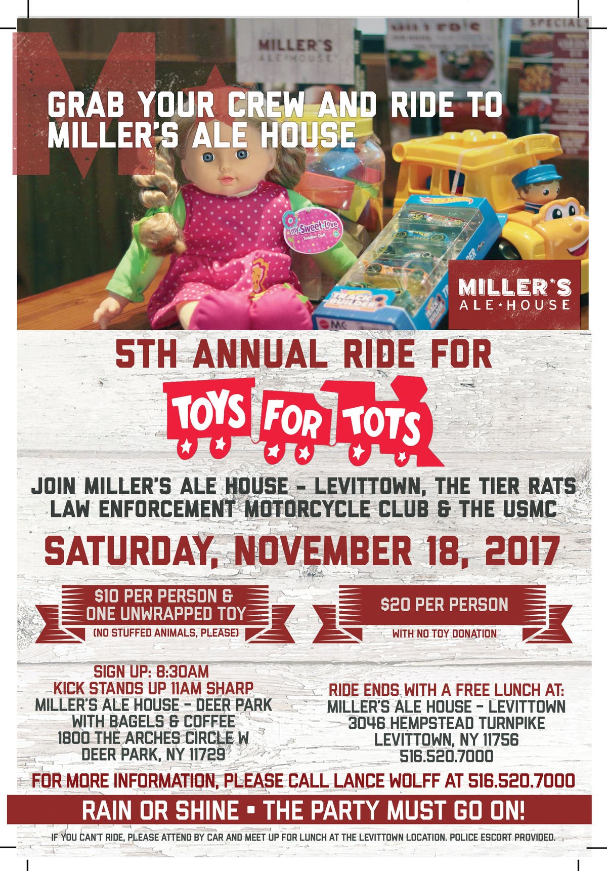 Lance Wolff (Assistant General Manager) and Nino Recine (General Manager), as well as the other managers at Miller’s Ale House Levittown, NY, their staff, and the US Marine Corps invite you to join the Tier Rats Law Enforcement Motorcycle Club and USMC in the Fifth Annual Toys for Tots Bike Run. This event will occur on Saturday, November 18th, 2017. It costs $10 per person with one unwrapped toy or $20 per person with no toy. Sign up begins at 8:30 A.M. at Miller’s Deer Park and Kick Stands up at 11:00 A.M. sharp. The ride ends at Miller’s Levittown Ale House with free lunch included. Police escort for the bike run will be provided. If you can’t ride, we ask that you attend by car. Meet up for lunch at Miller’s Ale House in Levittown. For more information, contact the managers at (516) 520-7000.