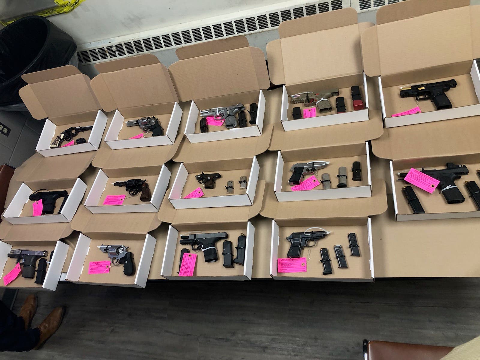First Squad detectives responded to the scene and recovered eight assault rifles, 10 semi-automatic handguns, and four revolvers, along with multiple ammunition feeding devices, police said.