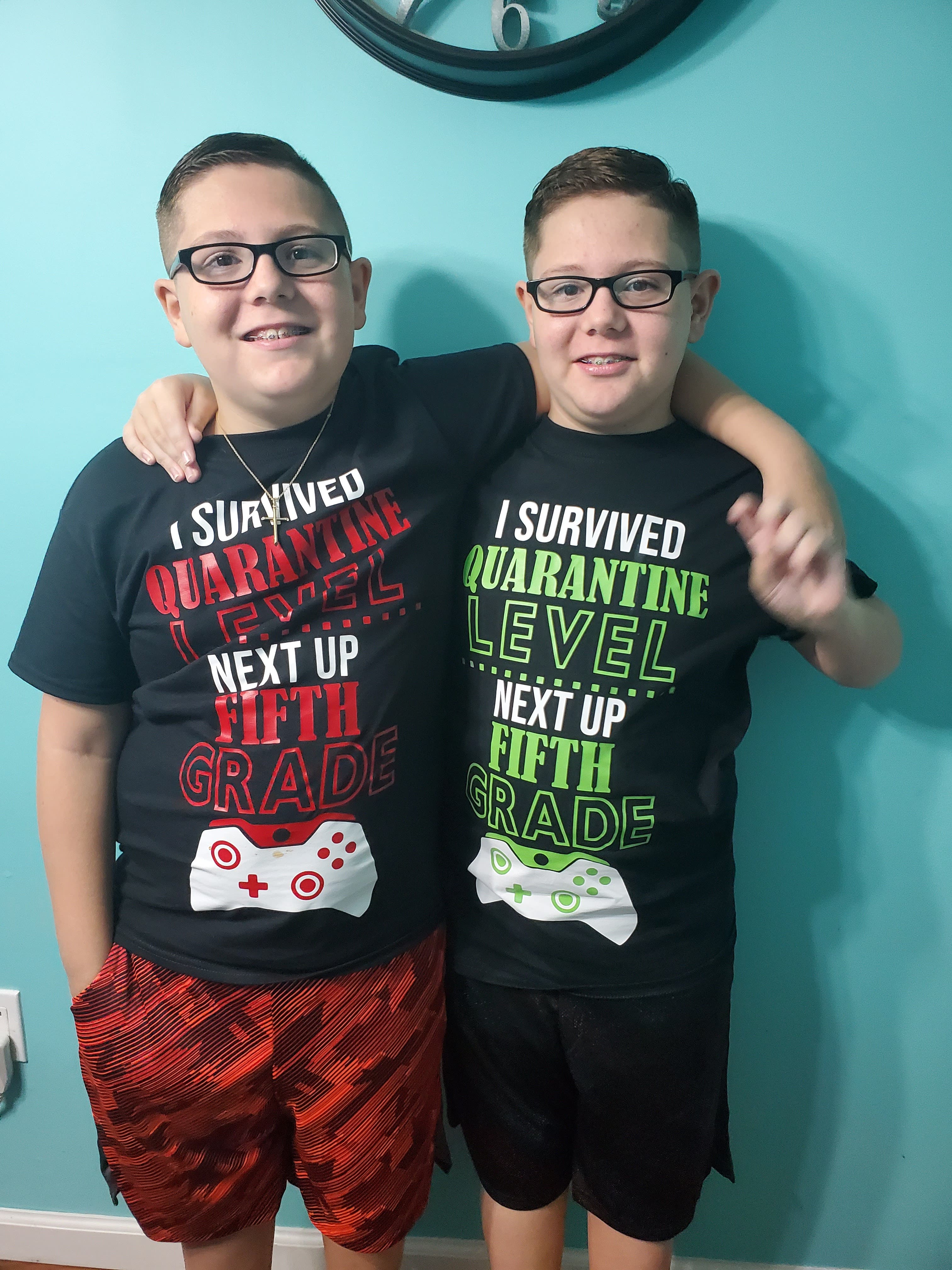 Twin brothers Rocco Bompartito (green writing on shirt) and Joe Joe Bompartito Jr. (red writing on shirt) started their first day of fifth grade at Harding Avenue Elementary School! Photos courtesy of Alyssa Bompartito