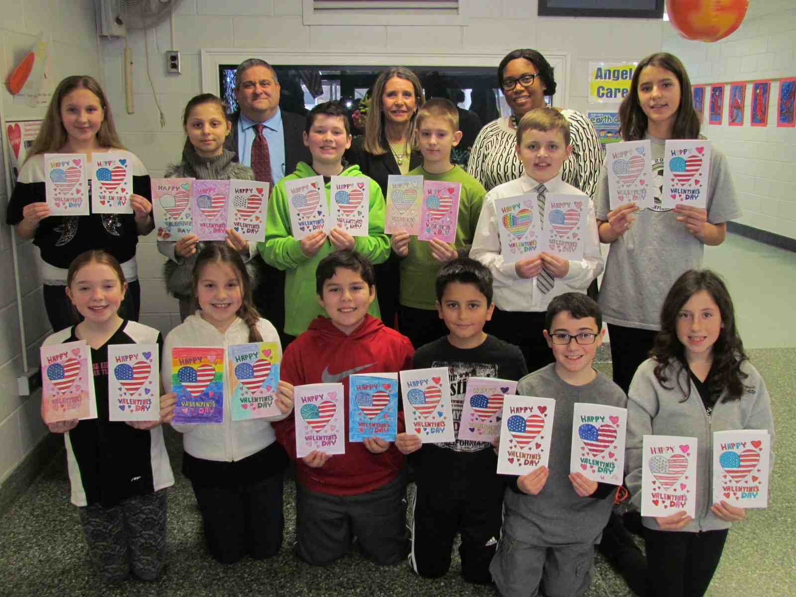 Photo courtesy of the Lindenhurst School District: Fifth-grade students of the Daniel Street Elementary School who took part in the Valentines for Veterans program with Superintendent of Schools Daniel E. Giordano, Principal Linda Domanico and Assemblywoman Kimberly Jean-Pierre.