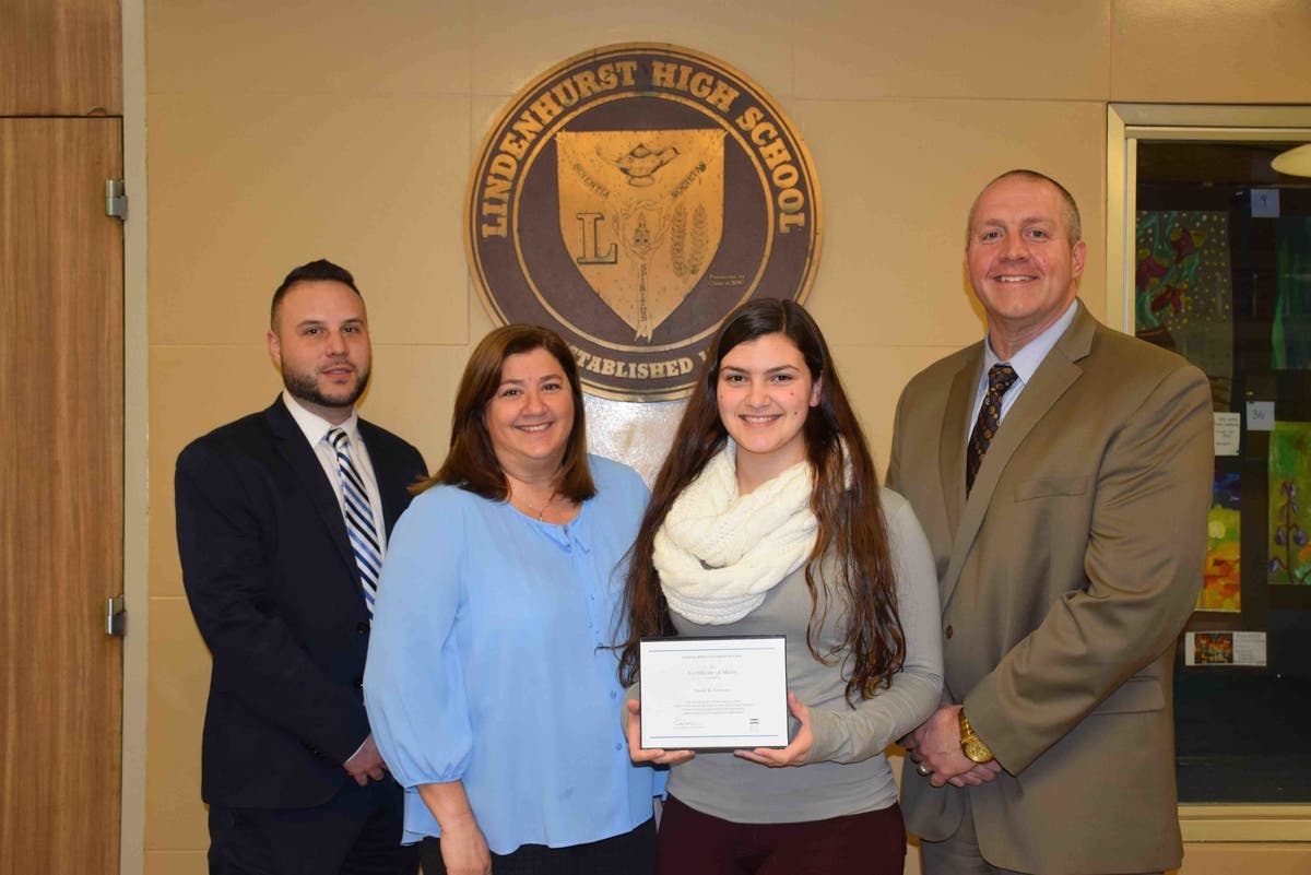 Photo capition: Lindenhurst High School senior Natalie Cotroneo is one of 2,500 students nationally to receive a $2,500 scholarship as she advanced to finalist standing in the National Merit Scholarship Program. From left, are Assistant Principal Daniel Noviello, school counselor Angela Ricciardi, finalist Natalie Cotroneo and Principal Christopher Gitz.