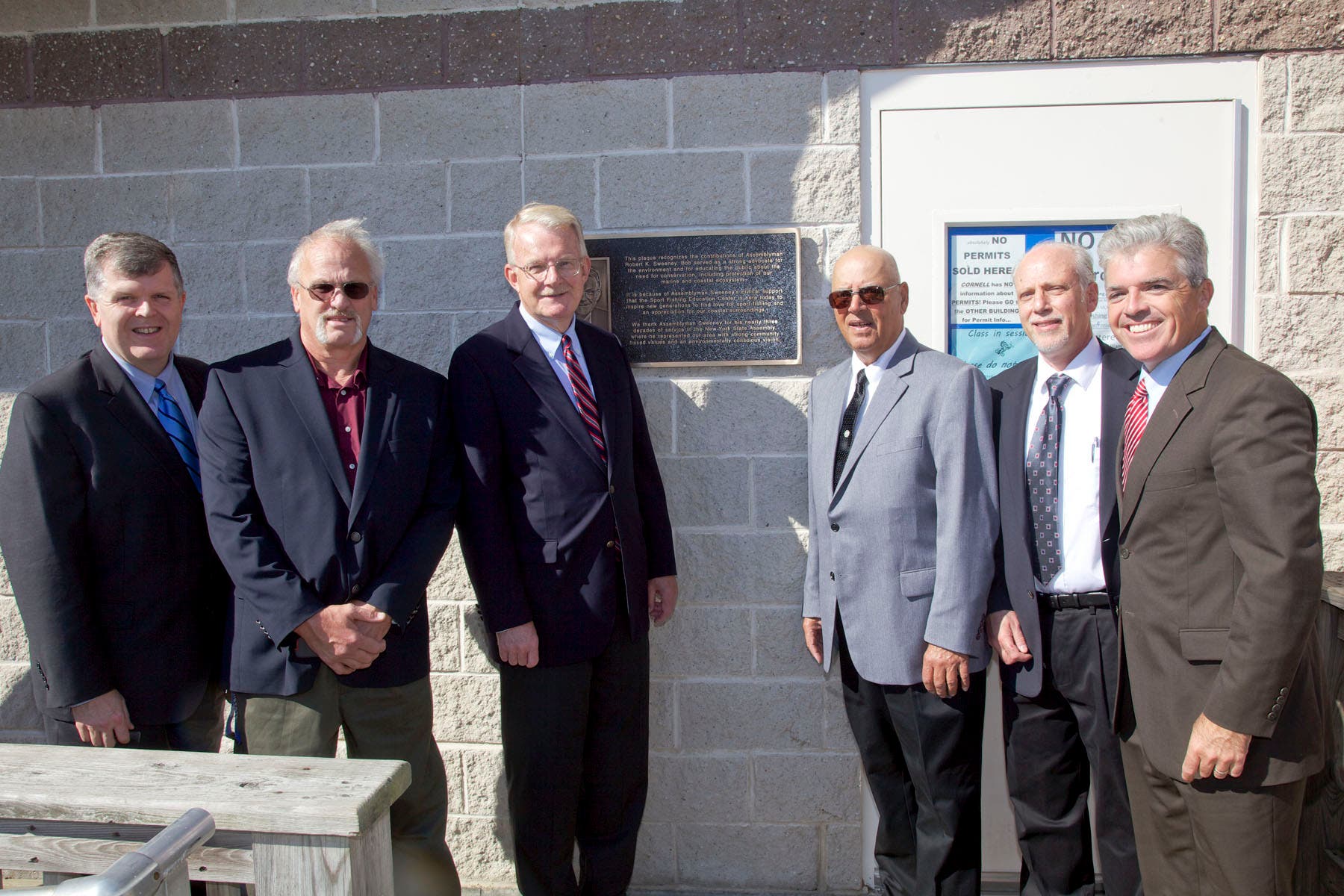 Pictured from left to right in front of the plaque at Supervisor Schaffer; John Manitone of the New York Fishing Tackle Trade Association (NYFTTA); Assemb. Sweeney; Ralph Votta, NYFTTA; Keith Alexander, NYFTTA; and County Executive Bellone.