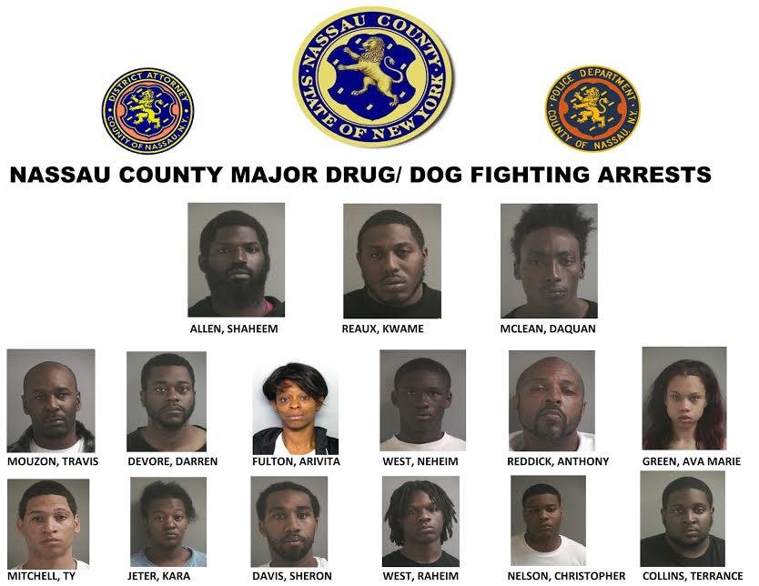 Investigators executed search warrants at five locations in Roosevelt in Freeport at 6 a.m. during an investigation into dog fighting and heroin overdoses. Men and women from Nassau, Suffolk, and Queens counties were charged with conspiracy, selling drugs, animal fighting, and more during the sting.