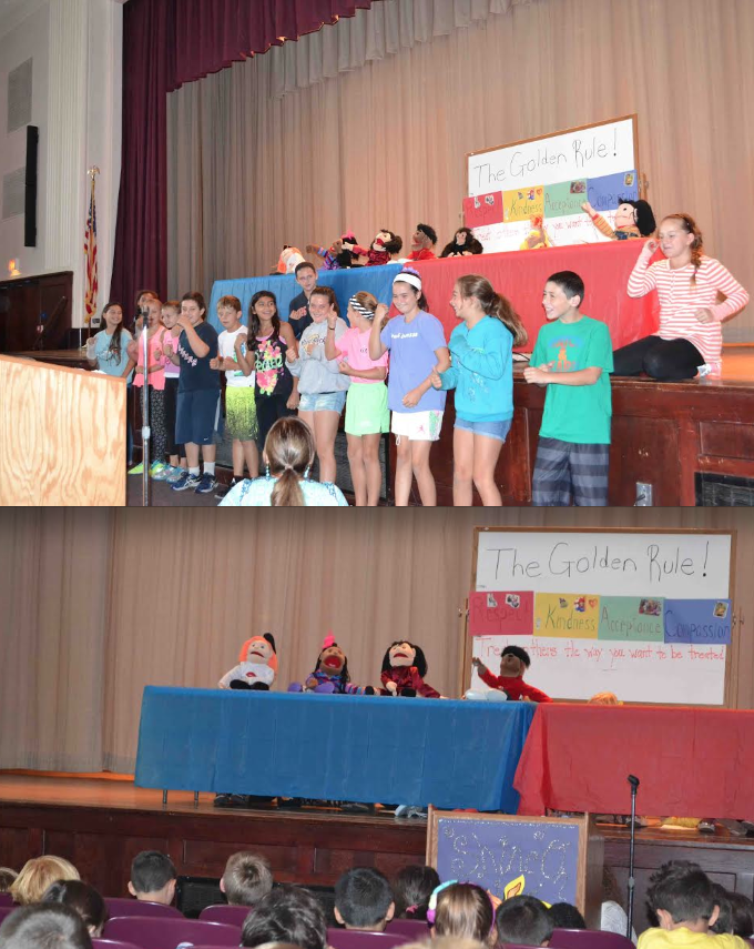 As the puppets introduced themselves and explained the ways in which they implement the Golden Rule, they encouraged students in the audience to practice greetings and kind phrases amongst themselves. Students then joined the puppets in singing a song about helping others.