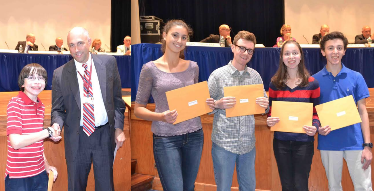 Photos: Dr. Kenneth Graham honored Joshua Kapilian for his participation in the Institute of Creative Problem Solving for Gifted and Talented; Director Dr. Dale Johansen introduced and honored the five 2014 New York All-State Festival participants. Pictured, L-R: Victoria Epstein, Max Tunney, Alexandra Kapilian, and Jonathan Kapilian (Not pictured: Maegan Miciotta).