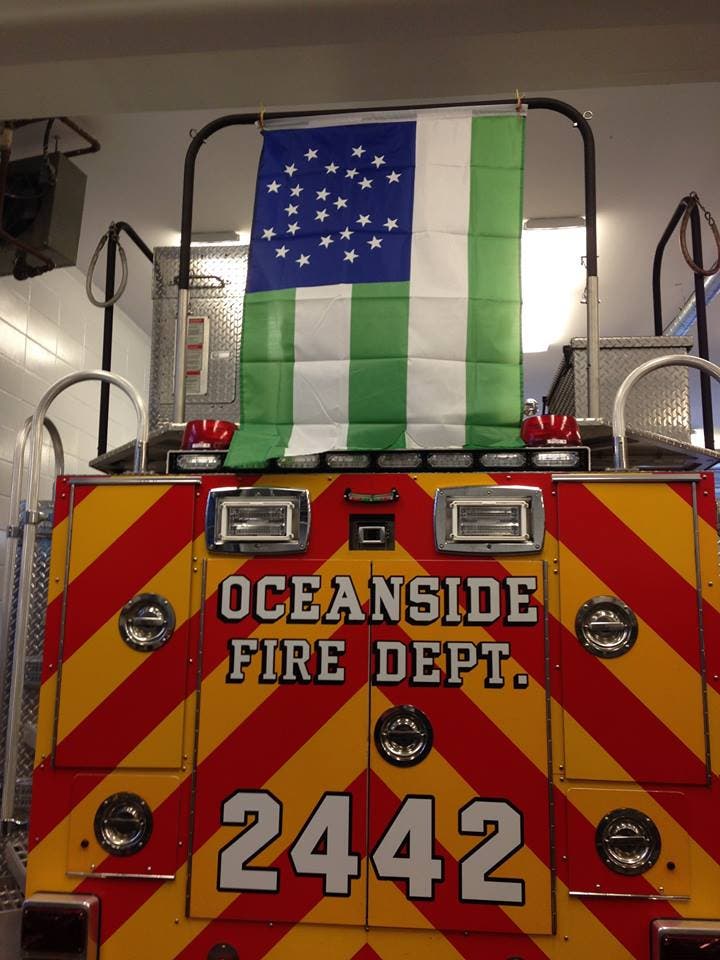 Oceanside Fire Department hung New York Police Department flags on their trucks Monday in honor of Brian Moore, of Massapequa, who succumbed to his injuries after being shot over the weekend. The department also added blue lines to their trucks in his honor.