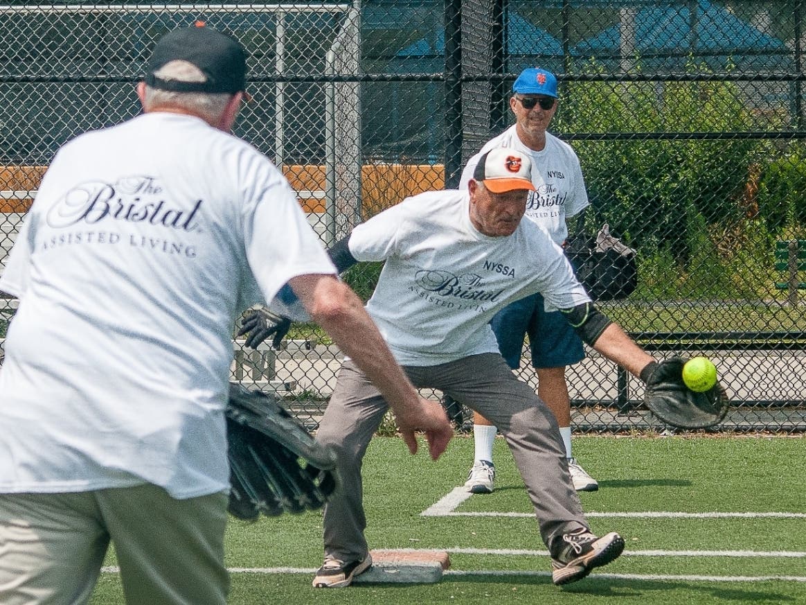 80 year-old First Base Coach Joe Prinzivalli of Point Lookout watches as 81 year-old First baseman Jim Giangrosso of Merrick makes the play during the annual Bristal All-Star game played at Cantiague Park in Hicksville. The players aged 80-92 play two doubleheaders a week. The All-Star game commemorated the 50-th Anniversary of the 1969 Mets World Series victory.