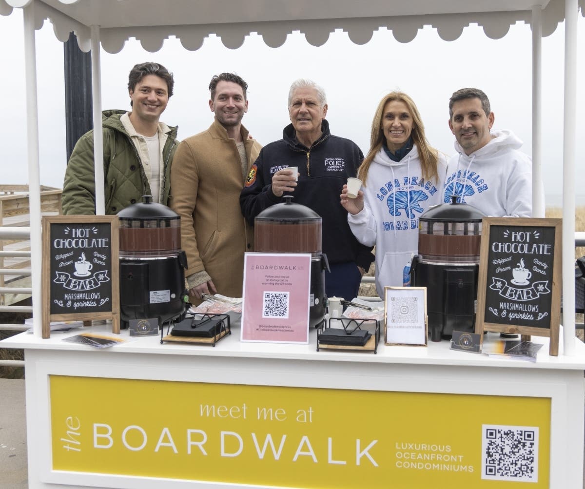Nassau County Executive, Bruce Blakeman (center) helped representatives of Douglas Elliman(left to right:) Nicholas Compagnone, Steven Halvey, Kristin Altfather and Glen Fox distribute hot chocolate to county residents who took part in Long Beach’s 24th annual Make-A-Wish Polar Bear Splash which was held adjacent to The Boardwalk, a $369 million condominium under construction overlooking the historic Long Beach boardwalk. The Boardwalk was built by B2K Development, which purchased the property in August 2021. Sales of the 200 owner-occupied condominiums ranging in price from $875,000-$4,500,000 are quite brisk. Owners will begin to move in this spring.