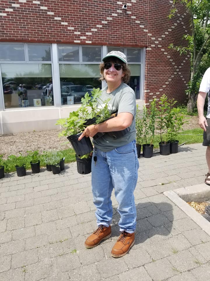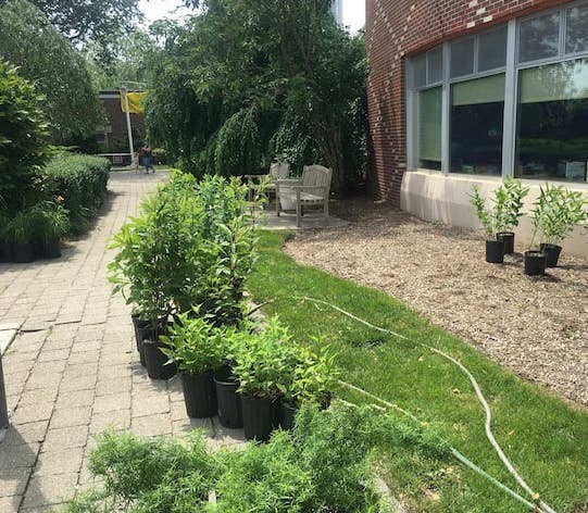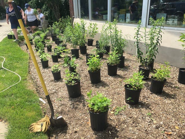 Plants were staged at the entrance of the Riverhead Free Library. The plants included a variety of asters and milkweeds, and other natives selected for color, shade to sun tolerance, pollinator benefit, spread and height characteristics, and soil conditions. Parsley and thyme were also planted for butterfly benefit.