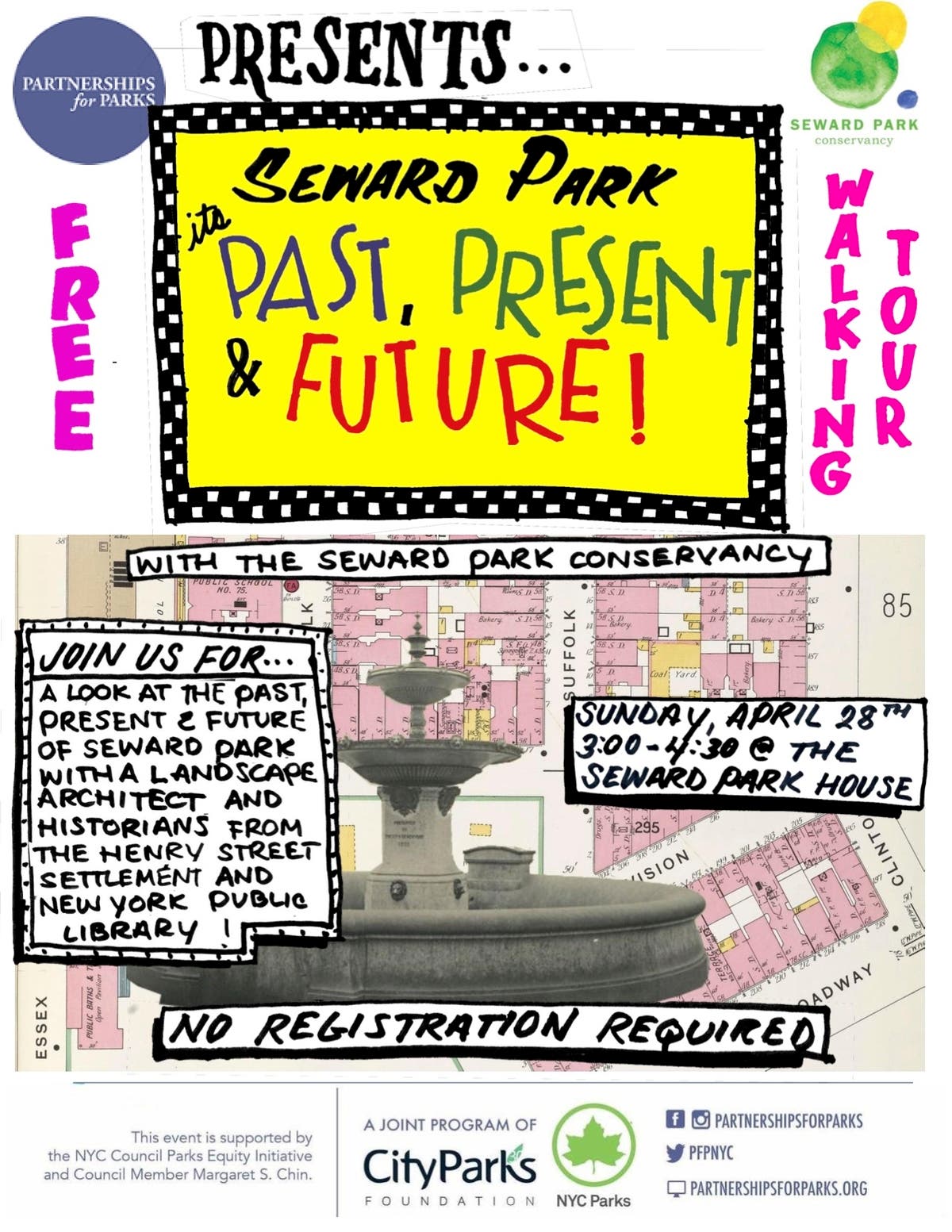 The tour is presented by Seward Park Conservancy in partnership with NYPL, Henry Street Settlement, the Parks Department. It is funded by a Parks Equity Grant from Councilwoman Margaret Chin to Partnerships for Parks, which was then allocated to Seward Park.