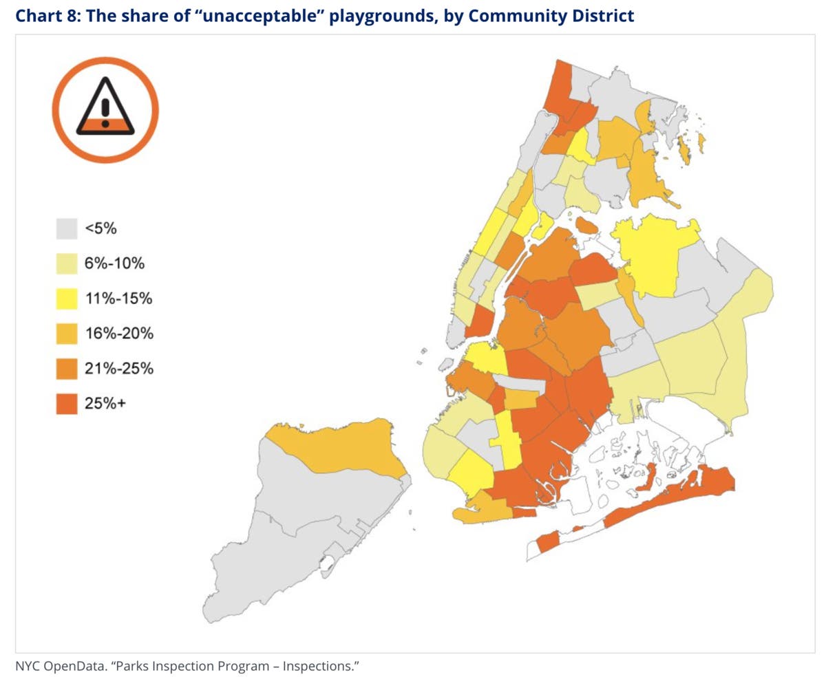 Conditions in Brooklyn were the worst, where 24 percent of playgrounds were "unacceptable."