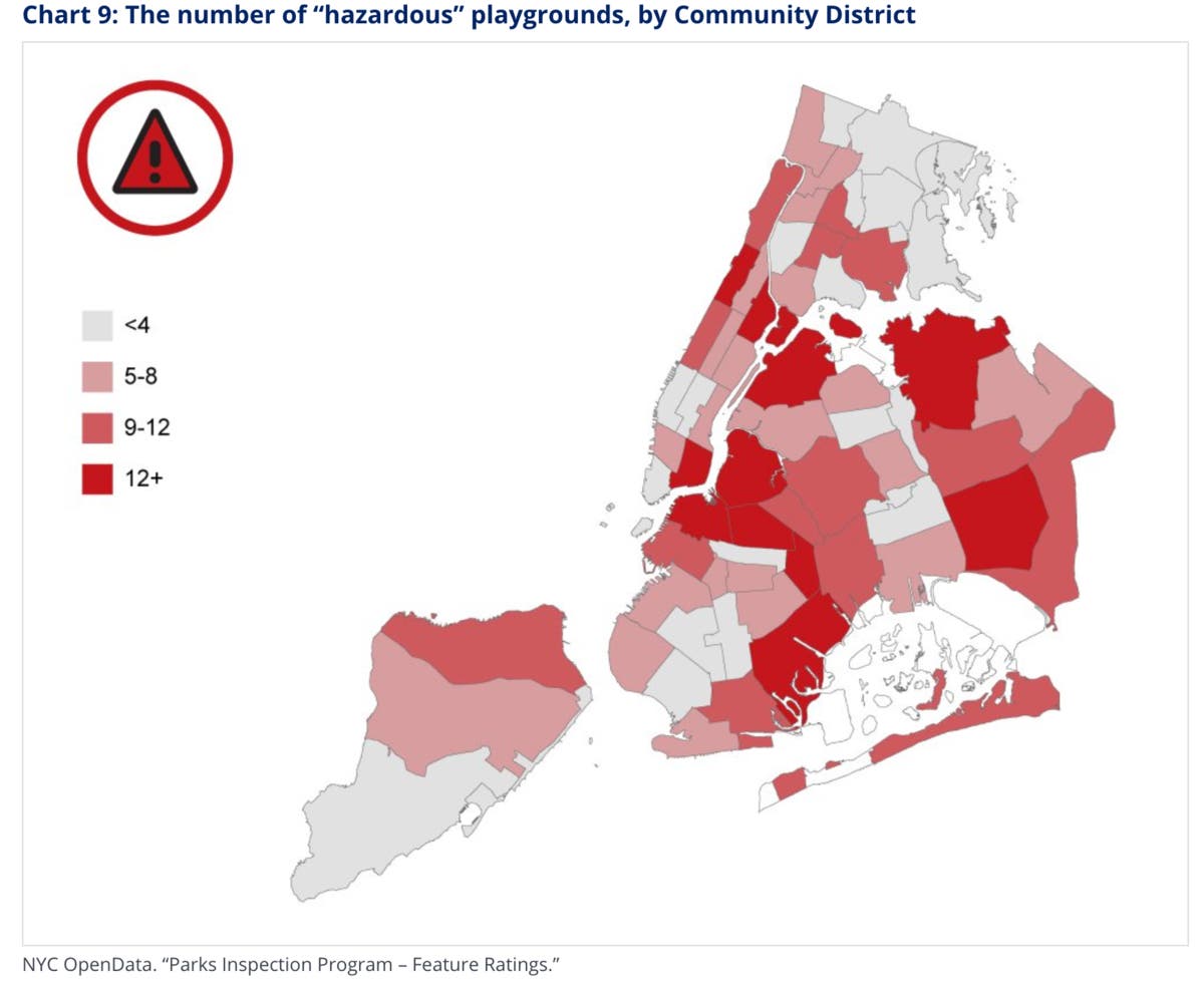 The report says the district was also among three community districts borough-wide and 11 citywide that had more than 12 playgrounds with "hazardous features that demanded immediate attention," such as issues with play equipment, benches, fences and paved surfaces.