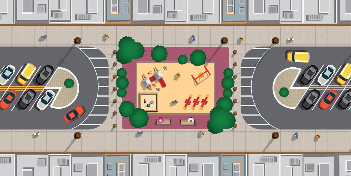 Stringer recommended retrofitting single block or dead-end streets with playgrounds in the center of angled parking and urged the city to build 100 new playgrounds in the next five years under this model, pictured below.