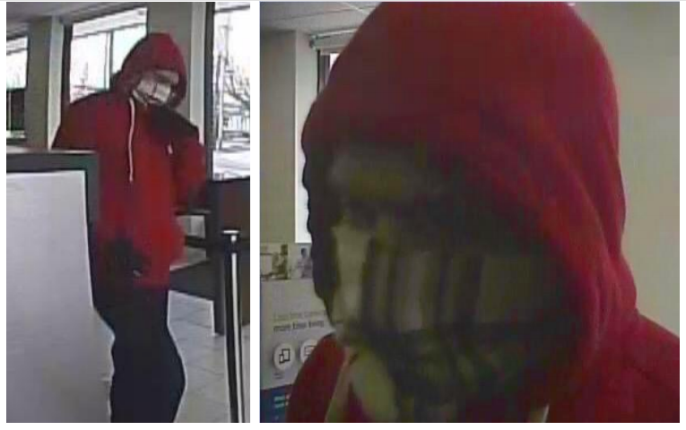 The subject was described as a white man in his 20s, 5-foot-8 to 5-foot-9, 150 pounds, and had blue eyes and a tattoo under his left eye. He was wearing a red hooded sweatshirt, dark colored pants, and a white and multi-colored scarf covering his nose and lower face.