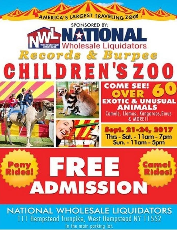 West Hempstead, NY, September 14, 2017 – National Wholesale Liquidators, a division of NSC Wholesale Holdings, is pleased to sponsor Records & Burpee Traveling Children’s Zoo at its store located at 111 Hempstead Turnpike, West Hempstead, NY. The event starts Thursday, September 21 and ends Sunday, September 24, 2017. The Zoo will be open Thursday through Saturday from 11:00am to 7:00pm and on Sunday from 11:00am to 5:00pm. The Zoo will be located in the main parking lot.