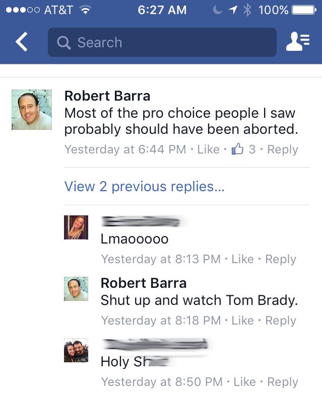 “Most of the pro choice people I saw probably should have been aborted,” Barra wrote.