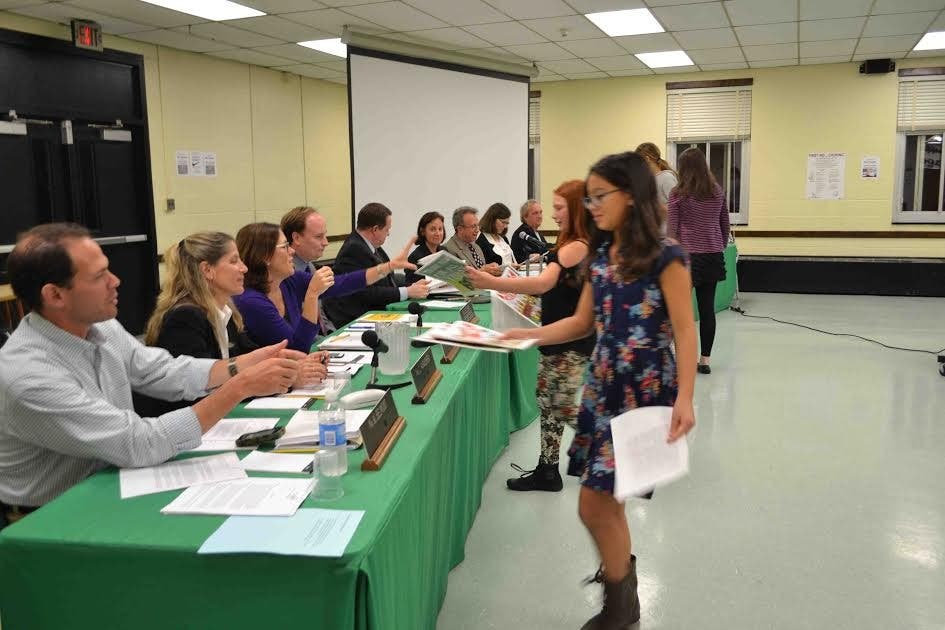 The public hearing involved discussions from Board members and comments from residents. Gold Star parents are eligible for a $20,000 property tax exemption, which represents the statutory default amount and would produce a $0.10 tax bill increase for taxpayers of District 20 who are not Gold Star parents. The Board may opt to lessen this number by half, which would bring a tax bill increase of $0.05 or raise it by up to 4.5 percent, bringing the tax bill increase to $0.45. The Board agreed to put this up for resolution in November at the $20,000 limit.