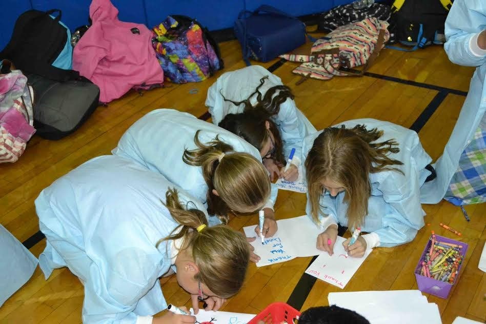 The student volunteers donned doctor’s scrubs and assisted with various tasks throughout the drive. They greeted attendees with signs, provided donors with required paperwork, decorated handmade “thank you” cards for contributors and even entertained guests in the waiting area with energetic songs and cheers. The walls of the gymnasium, where the blood drive was held, were lined with signs created by students illustrating the value of giving blood.