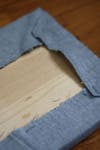 Fold in the corners so they lay flat. Well, as flat as you can get them. Staple each fold so it is secure. Once you have done each corner, turn the shelf over and make sure the fabric is tight in all areas. You can also remove a staple to fix it, so no worries.