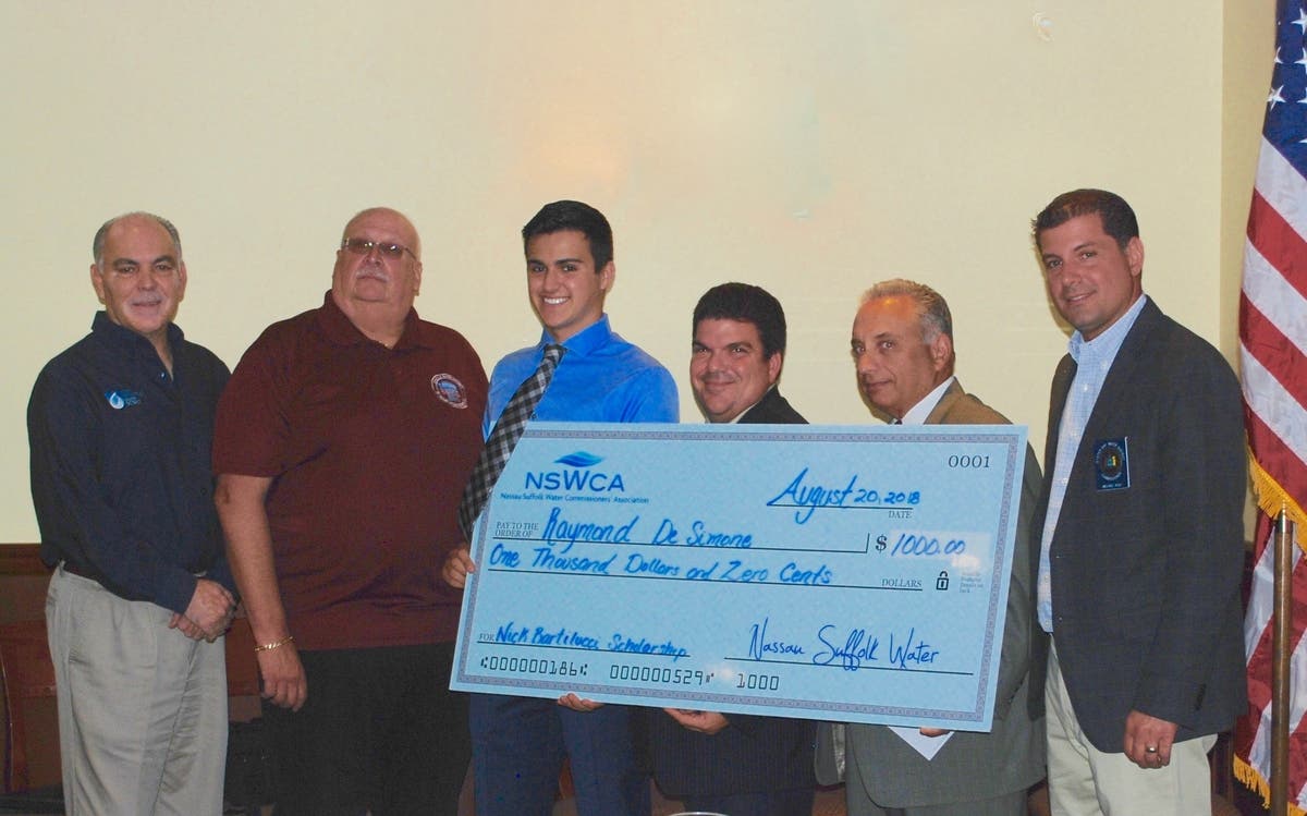 PHOTO CAPTION: Pictured from left to right at a recent Nassau Suffolk Water Commissioners’ Association (NSWCA) meeting where the Nicholas J. Bartilucci Manhattan College Scholarship was awarded to a Carle Place entering college freshman are: NSWCA Secretary and West Hempstead Water District Commissioner Kenneth P. Wenthen Jr.; NSWCA Second Vice President and Hicksville Water District Commissioner William Schuckmann; Nicholas J. Bartilucci Manhattan College Scholarship Recipient Raymond DeSimone holding his awarded scholarship; NSWCA President and Westbury Water District Commissioner Vincent Abbatiello; NSWCA Treasurer and Carle Place Water District Commissioner Lawrence F. Zaino Jr; and NSWCA First Vice President and Oyster Bay Water District Commissioner Michael F. Rich III.