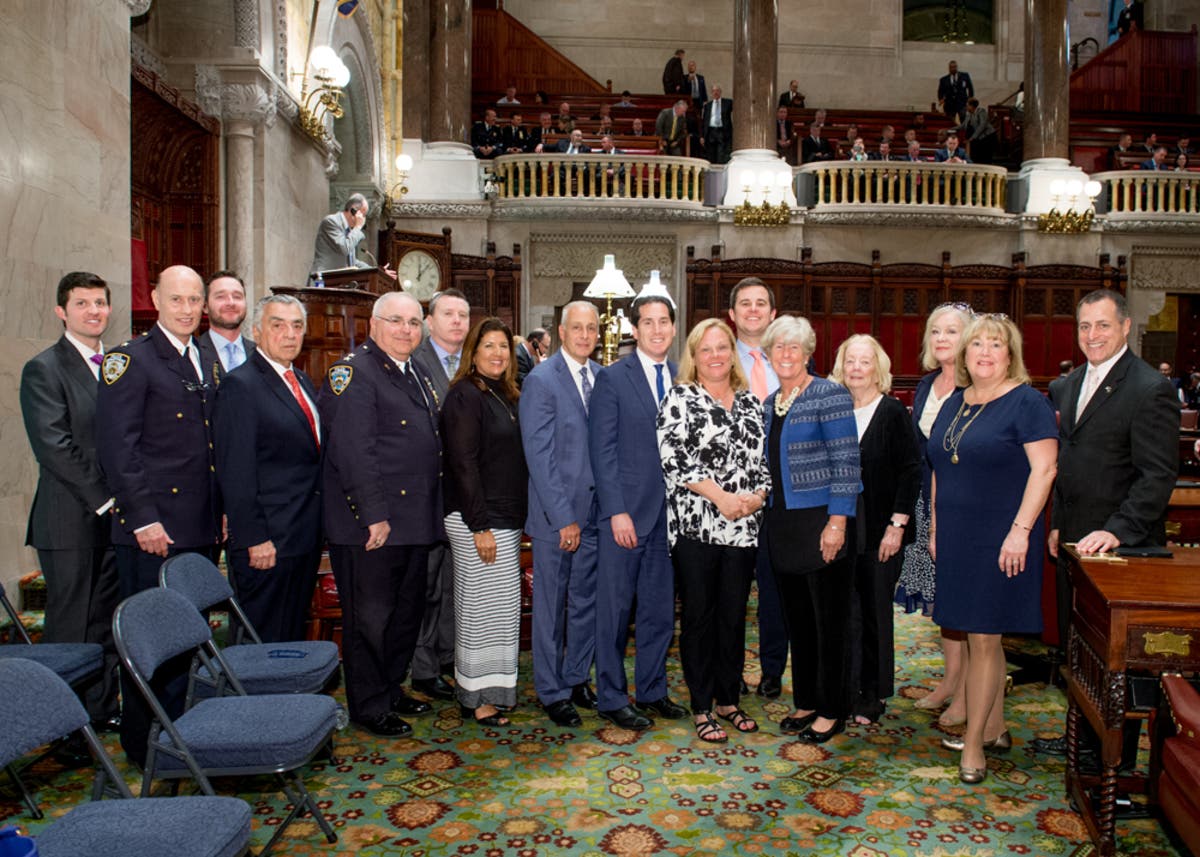 Det. Steven McDonald's family joined police officials and senators for the passage of the bill through the Senate in June. Photo: Todd Kaminsky's Office.