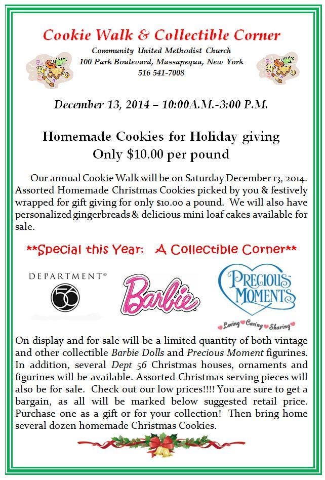 Our annual Cookie Walk will be on Saturday December 13, 2014. Assorted Homemade Christmas Cookies picked by you & festively wrapped for gift giving for only $10.00 a pound. We will also have personalized gingerbreads & delicious mini loaf cakes available for sale.