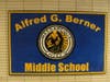 A red mural in a first floor hallway reads "Berner High 1962 to 1987." But there's also a blue and gold Alfred G. Berner Middle School Banner.