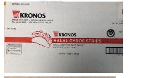 - 10-lb. cardboard box packages containing bulk plastic wrapped raw frozen ground beef gyros labeled “KRONOS HALAL GYROS STRIPS” HALAL CERTIFIED BEEF GYROS UNCOOKED, IQF STRIPS with a case code 19 159.