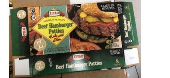 - Retail sized (8 patties) cardboard box packages containing “ZIYAD PREMIUM QUALITY Beef Hamburger Patties” with a case code 911541.021541.