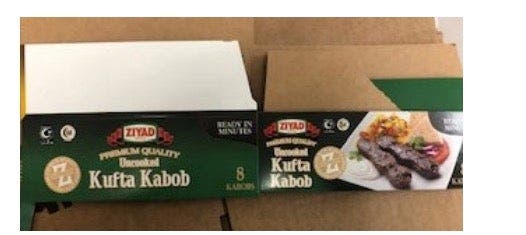 - Retail sized (8 kabobs) cardboard box packages containing “ZIYAD PREMIUM QUALITY Uncooked Kufta Kabob” with a case code 911154.021154.