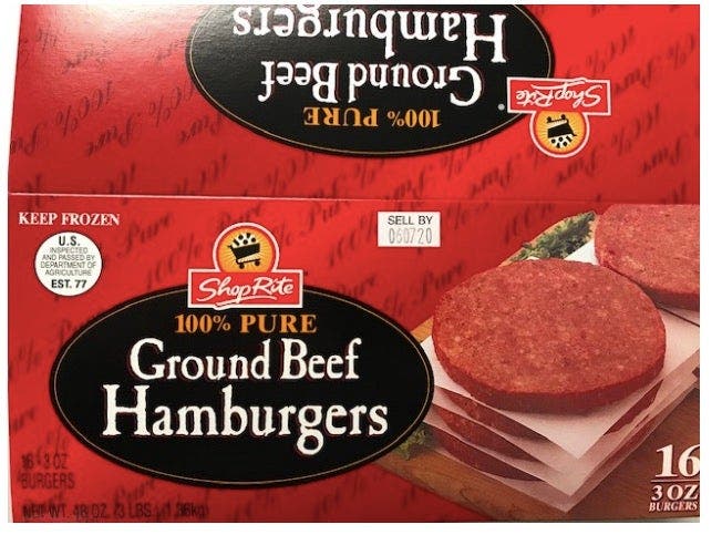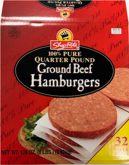 - 8-lb. cardboard box packages containing bulk plastic wrapped raw frozen ground beef patties labeled “Shop Rite 100% PURE QUARTER POUND Ground Beef Hamburgers” and a sell by date of 060720.