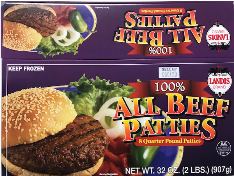 - 2-lb. cardboard box packages containing plastic wrapped raw frozen ground beef patties labeled “LANDIS BRAND 100% ALL BEEF PATTIES 8 Quarter Pound Patties” and a sell by date of 060720.