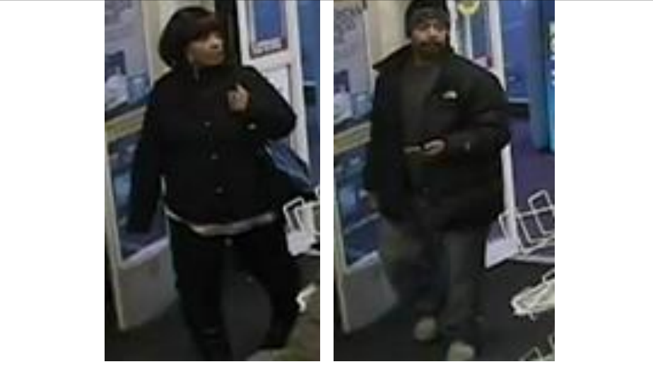Cops said the woman was about 45 years old, 5-foot-2, and had shoulder length hair that may have been a wig. She was carrying a large handbag at the time. The man was about 30 years old, 5-foot-8, average build, and had a short beard/mustache. He was wearing a black North Face jacket, cops said.
