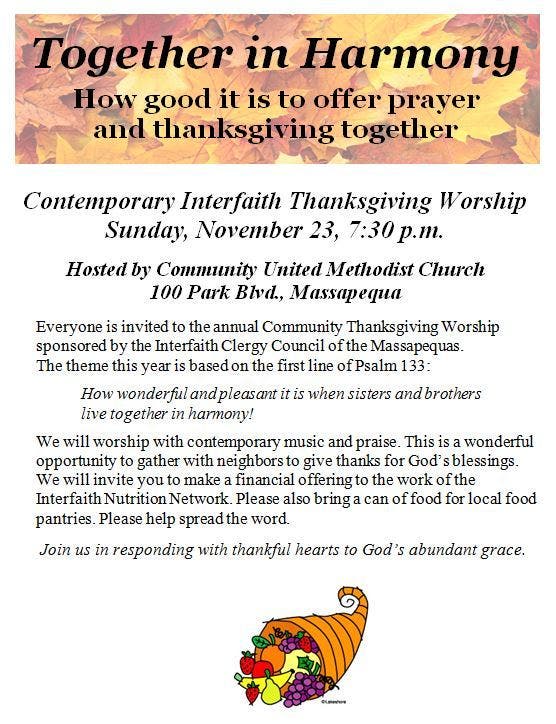 Everyone is invited to the annual Community Thanksgiving Worship sponsored by the Interfaith Clergy Council of the Massapequas.