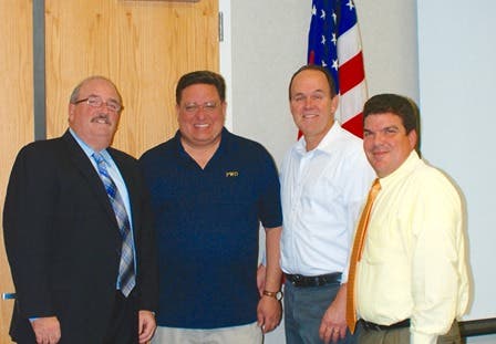 PHOTO CAPTION: Pictured from left to right during a recent Nassau Suffolk Water Commissioners’ Association meeting are: NSWCA Guest Speaker Joseph Frank, principal of Sapienza and Frank; Plainview Water Commissioner and NSWCA 2nd Vice President Andrew Bader; Massapequa Water Commissioner and NSWCA President Thomas P. Hand; and Westbury Water Commissioner and NSWCA Secretary Vincent Abbatiello.
