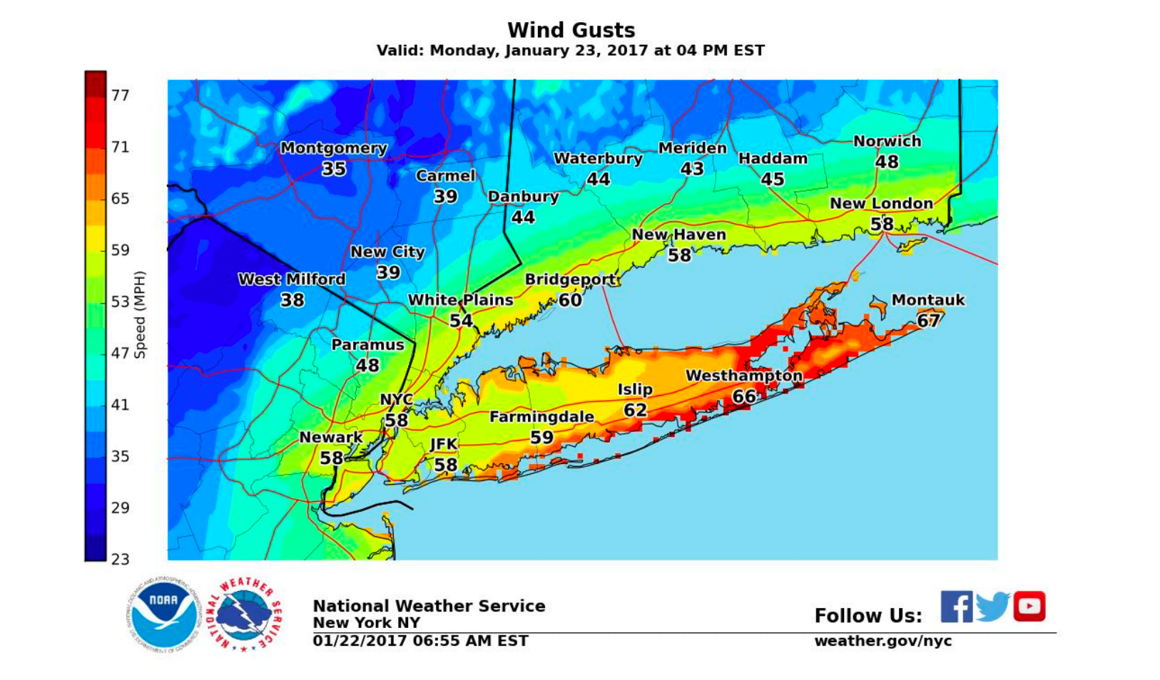 A high wind warning will be in effect for the island from 1 a.m. Monday until 1 a.m. Tuesday. Sustained winds of 30-40 mph are expected, with gusts up to 70 mph, just 4 mph under hurricane-force. The strongest winds are expected along the South Shore and the East End. Winds could begin gusting as high as 45 mph just before daybreak Monday and then increase in strength through the afternoon and evening.