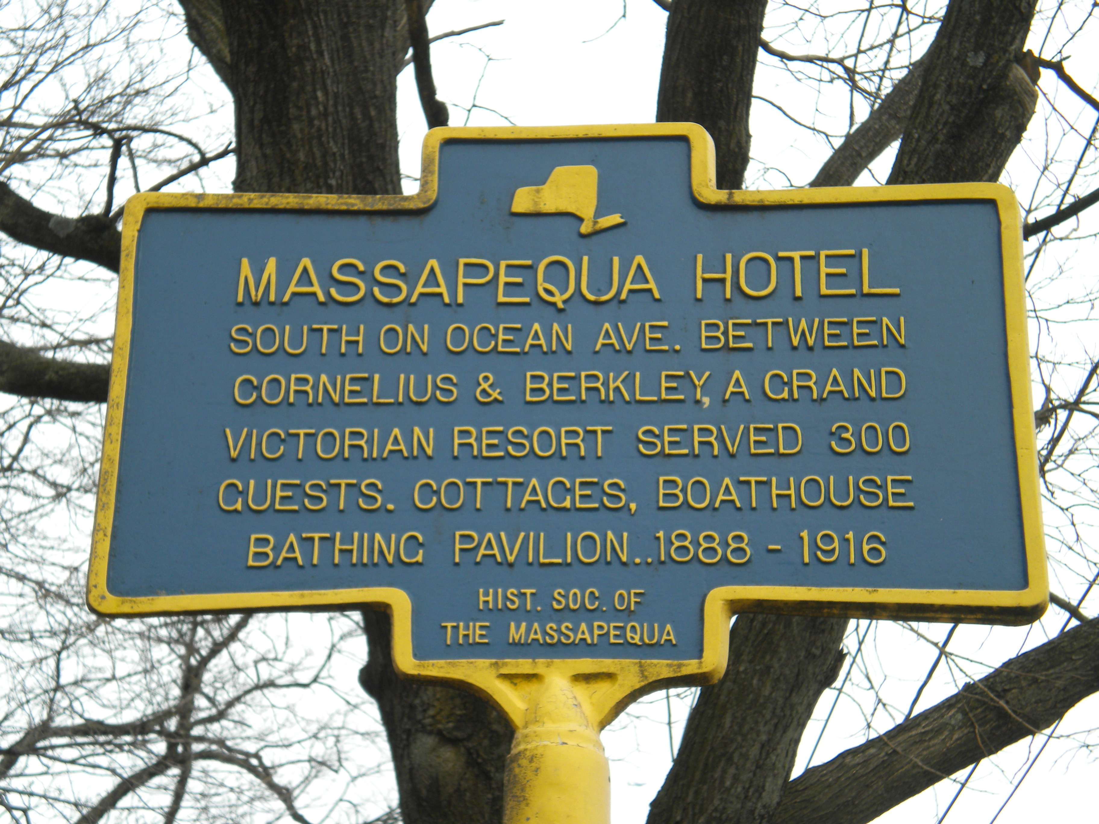 The Historical Society of the Massapequas recognized the uniqueness of the Massapequa Hotel and erected a marker in 2008. William Colfer was the President and several residents who lived in the former cottages attended the ceremony. The marker is located on Merrick Road and Ocean Avenue, at the southwest corner of Massapequa Lake and at the beginning of the Nassau-Suffolk Trail, in order to attract the attention of as many motorists and walkers as possible.