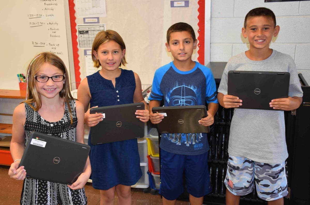 East Lake Elementary School fifth-graders, from left, Emma DeAngelo, Emily Frencel, Nicholas Archipolo and Anthony Pastier received their new Chromebooks which they will have anytime access to during the school day.