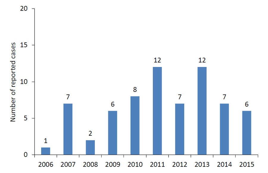 New York has had 16 cases from 2006-2015, the second highest number in the country, according to The Centers for Disease Control and Prevention. Other states with reported cases are Minnesota, 20; Wisconsin, 15; Massachusetts, 8; New Jersey, 3; Maine, 2; New Hampshire, 1; Pennsylvania, 1; and Virginia 1.