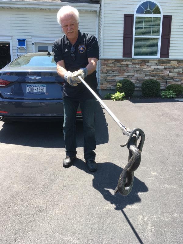 SPCA officials say a Medford resident "frantically alerted" Det. Dominic Mozzone about the snake. Mozzone, who has attended the SPCA's dangerous reptile training, was ready and able to safely remove the black racer snake from their home.